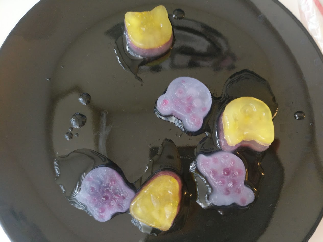 And the finished product! I don't think I waited quite long enough as they're still a bit melty, but they came out quite well. As for the taste they have a nice texture to them. I was worried it would be difficult to eat being frozen but it slushes well in my mouth. Mostly ramune slush, that is. The upper yellow didn't quite freeze all the way and even then retains its gummy texture. The taste is quite pleasant but a little one note, half only have the flavor of ramune (the pink doesn't come out too much besides a little tanginess) and half have the lemon fruit candy flavor added on which is a nice touch. This was a very fun and cute idea. But I think it could be even better with more variation on taste, as currently it's just a nice frozen treat.